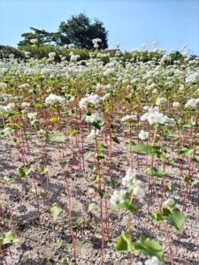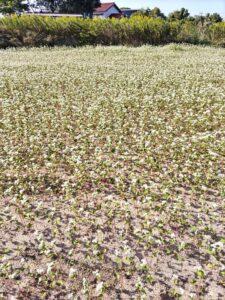 そして今日、ふと一番小さなハウスの裏に回ってみると、そこには蕎麦の花が一面に咲いていました。